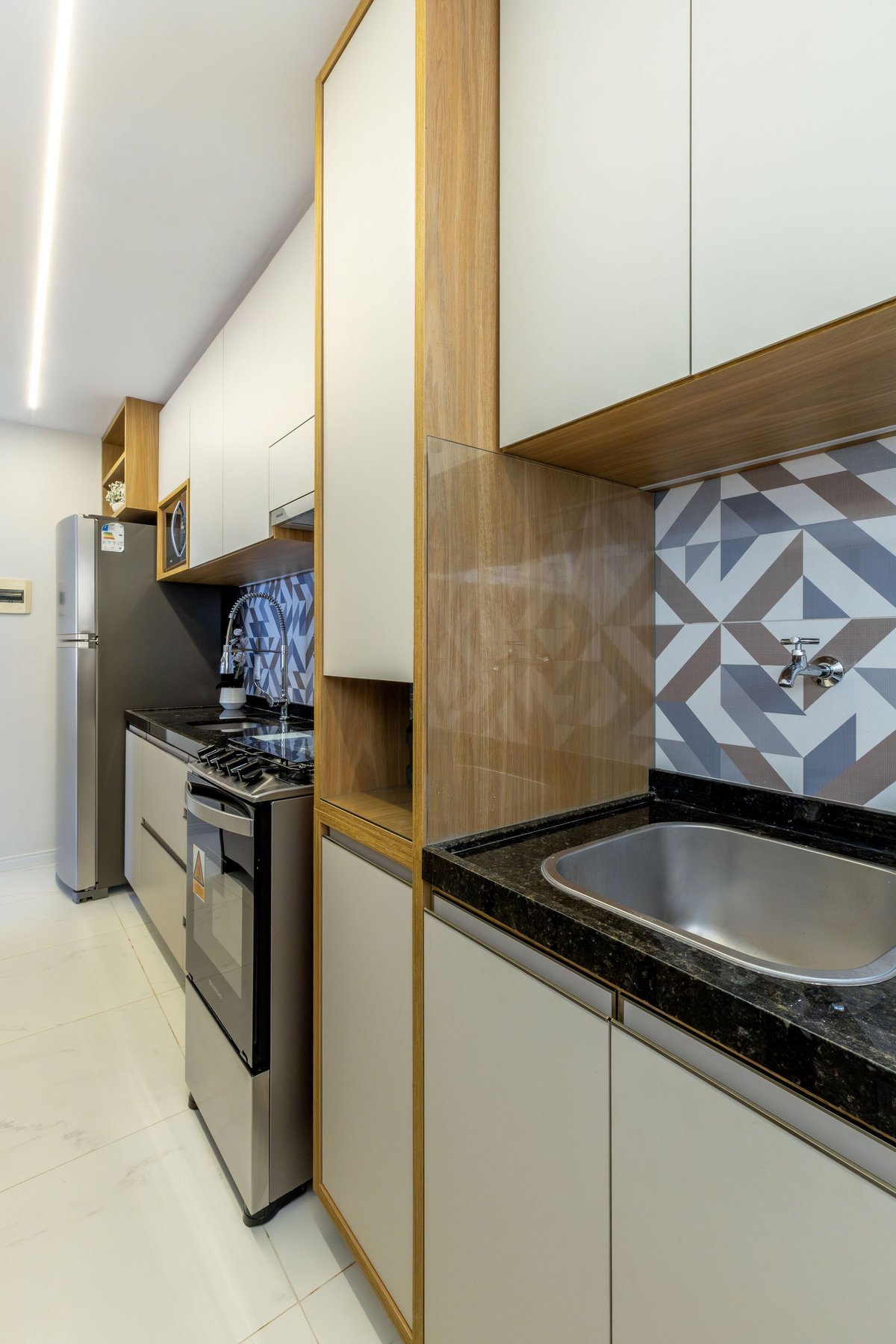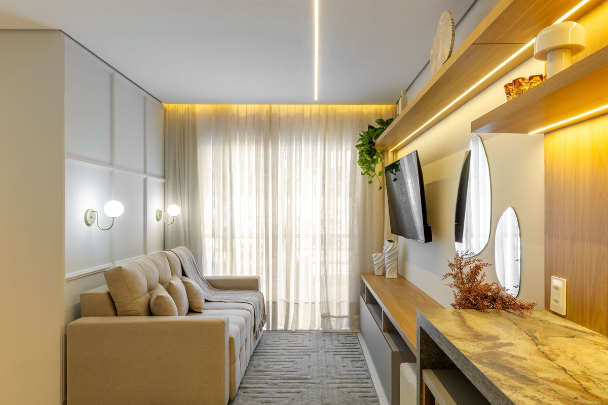 A marcenaria planejada é um dos grandes destaques: tons amadeirados, painéis iluminados com fitas de LED e armários com acabamento em mdf fosco compõem os espaços, como a sala, a cozinha e o quarto. As soluções de iluminação indireta valorizam os revestimentos e criam uma atmosfera mais intimista.