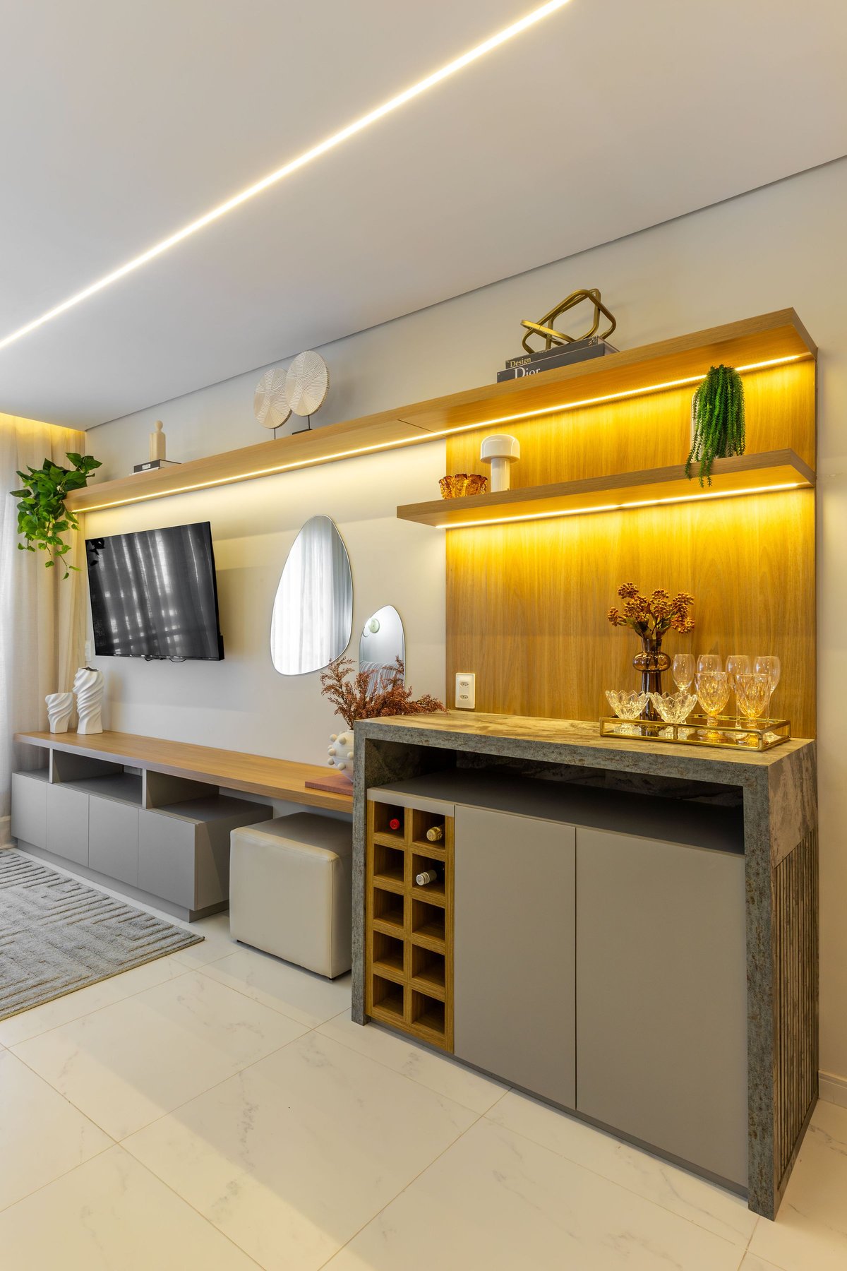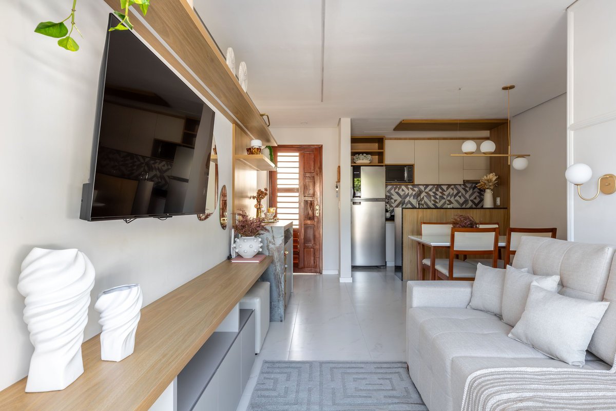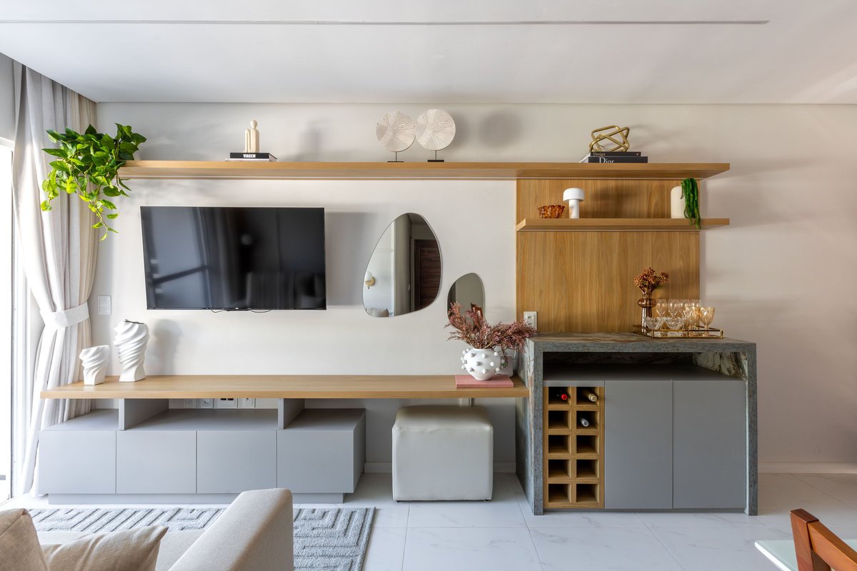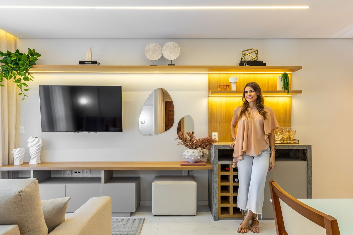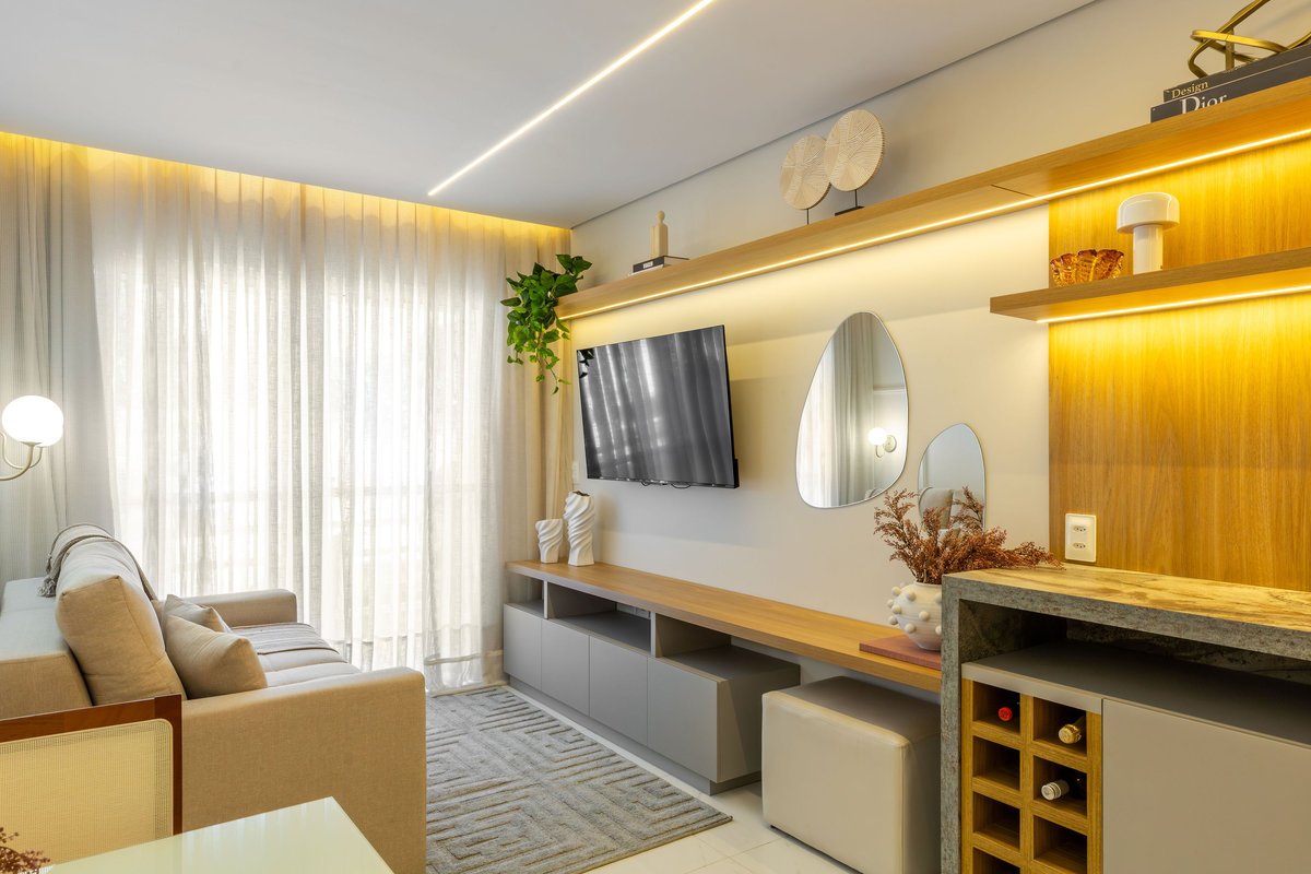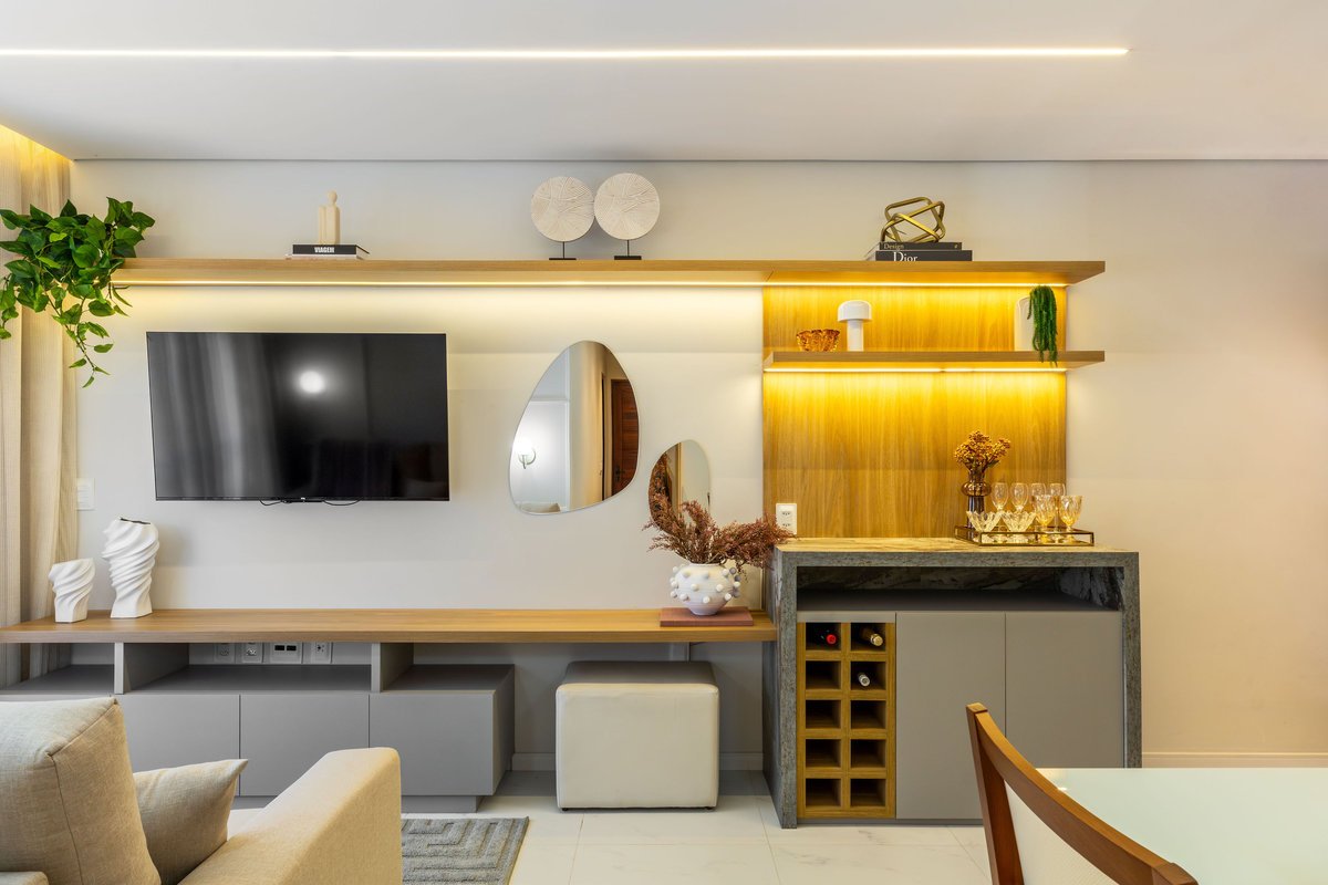 Na sala, o painel de TV com prateleiras iluminadas e espelhos orgânicos amplia visualmente o ambiente, enquanto o barzinho integrado oferece praticidade e charme para receber convidados. A cozinha ganhou uma combinação elegante de madeira e tons claros, além de um detalhe geométrico no revestimento da parede, que trouxe um toque de personalidade ao espaço.