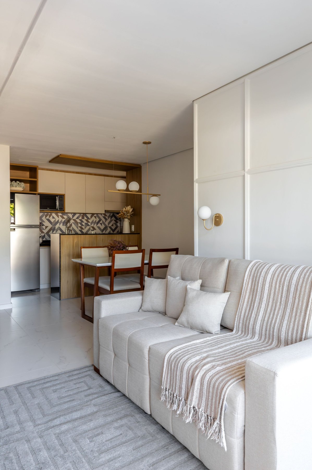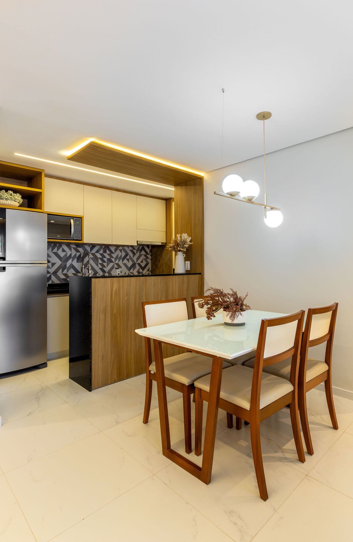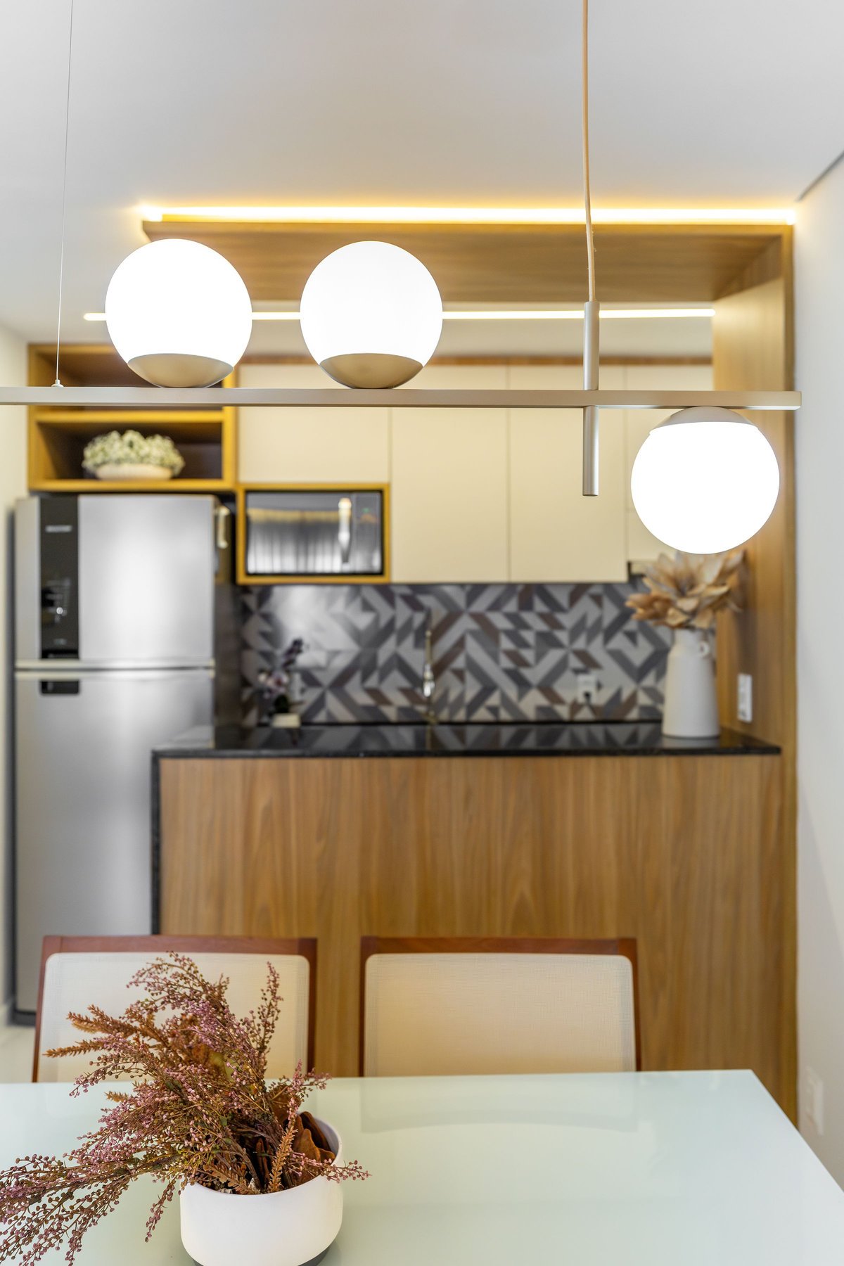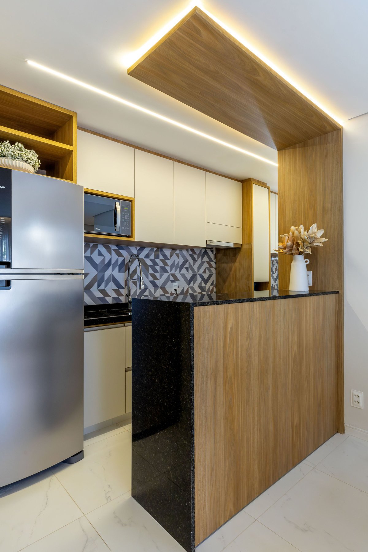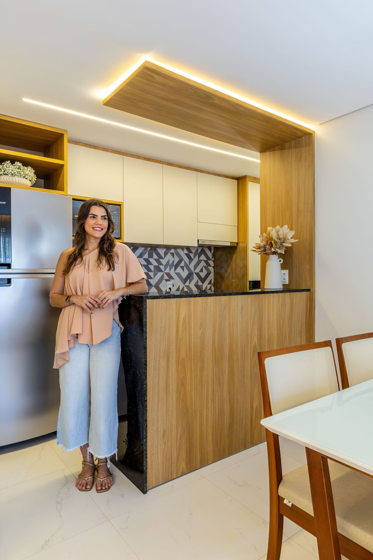 Na sala, o painel de TV com prateleiras iluminadas e espelhos orgânicos amplia visualmente o ambiente, enquanto o barzinho integrado oferece praticidade e charme para receber convidados. A cozinha ganhou uma combinação elegante de madeira e tons claros, além de um detalhe geométrico no revestimento da parede, que trouxe um toque de personalidade ao espaço.