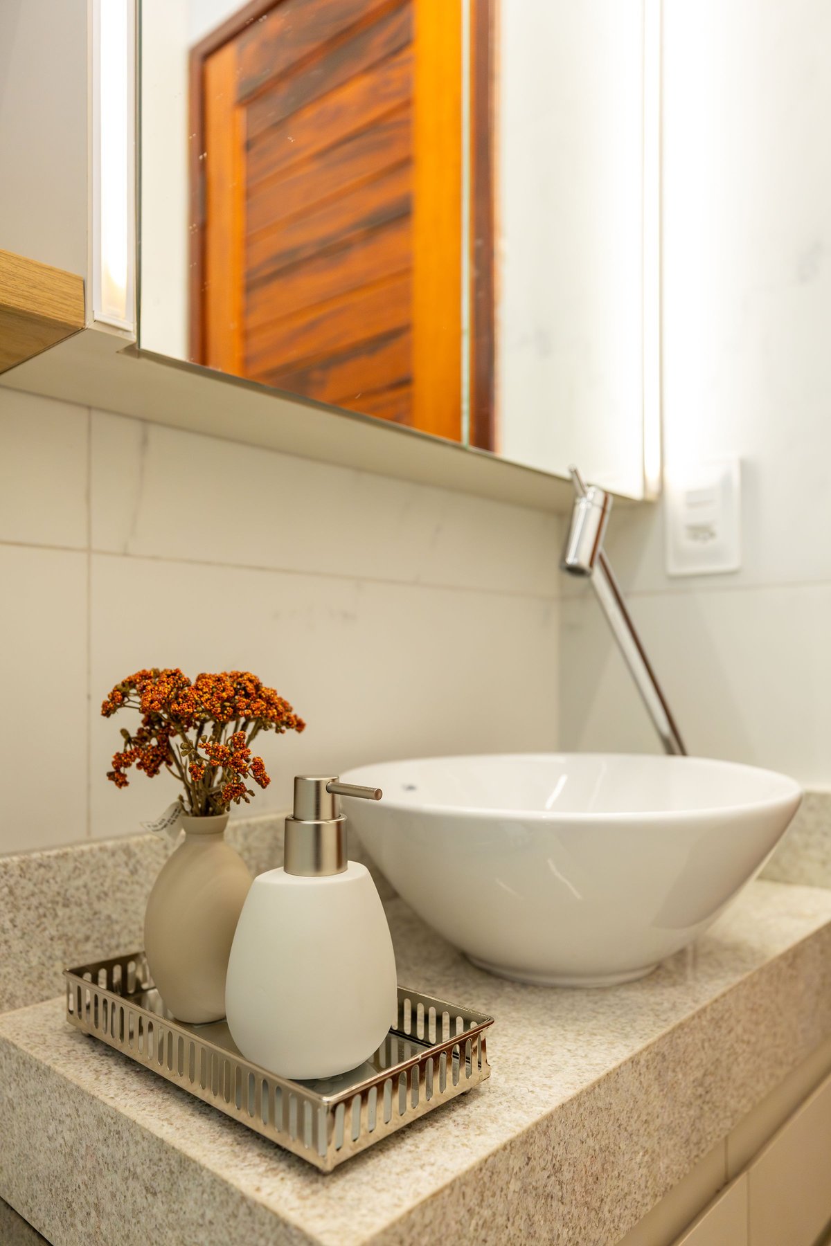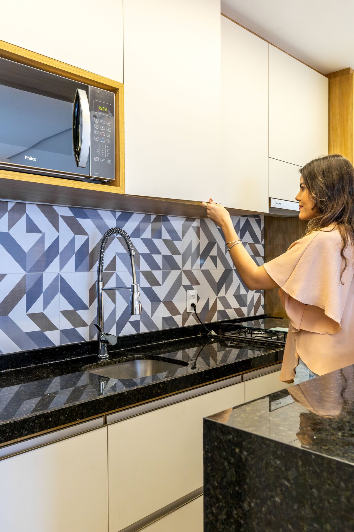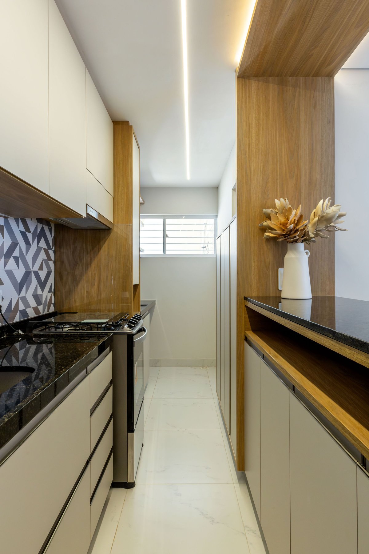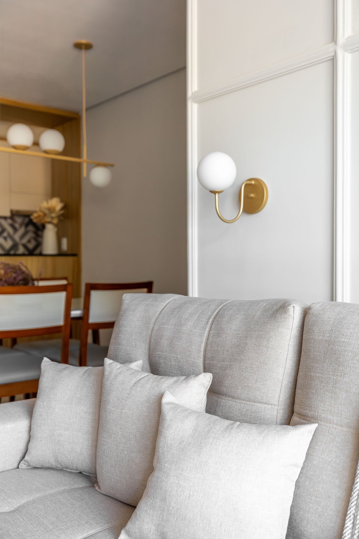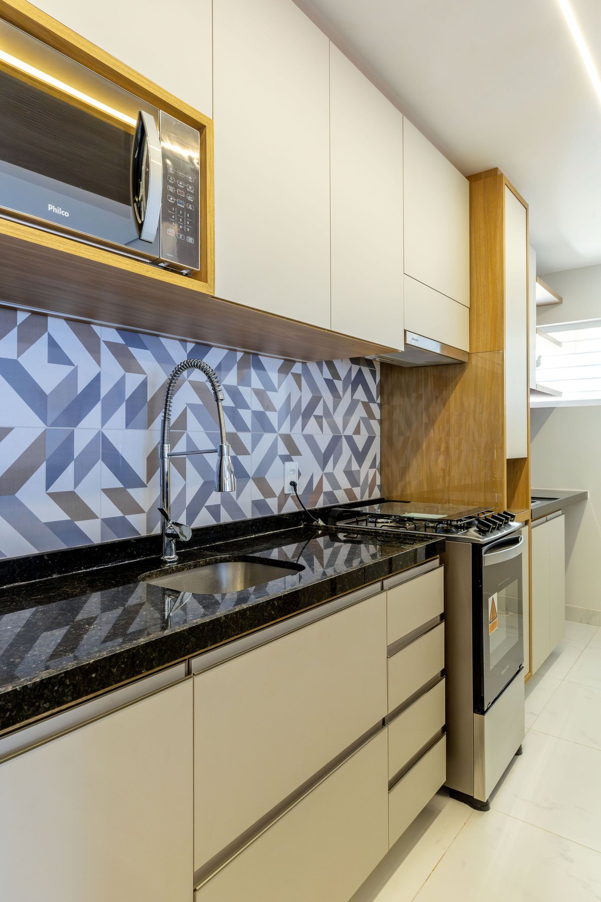 Na sala, o painel de TV com prateleiras iluminadas e espelhos orgânicos amplia visualmente o ambiente, enquanto o barzinho integrado oferece praticidade e charme para receber convidados. A cozinha ganhou uma combinação elegante de madeira e tons claros, além de um detalhe geométrico no revestimento da parede, que trouxe um toque de personalidade ao espaço.