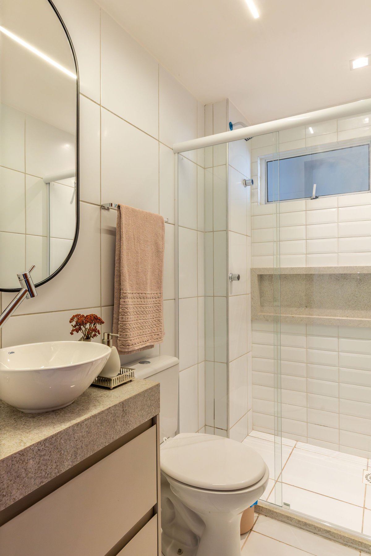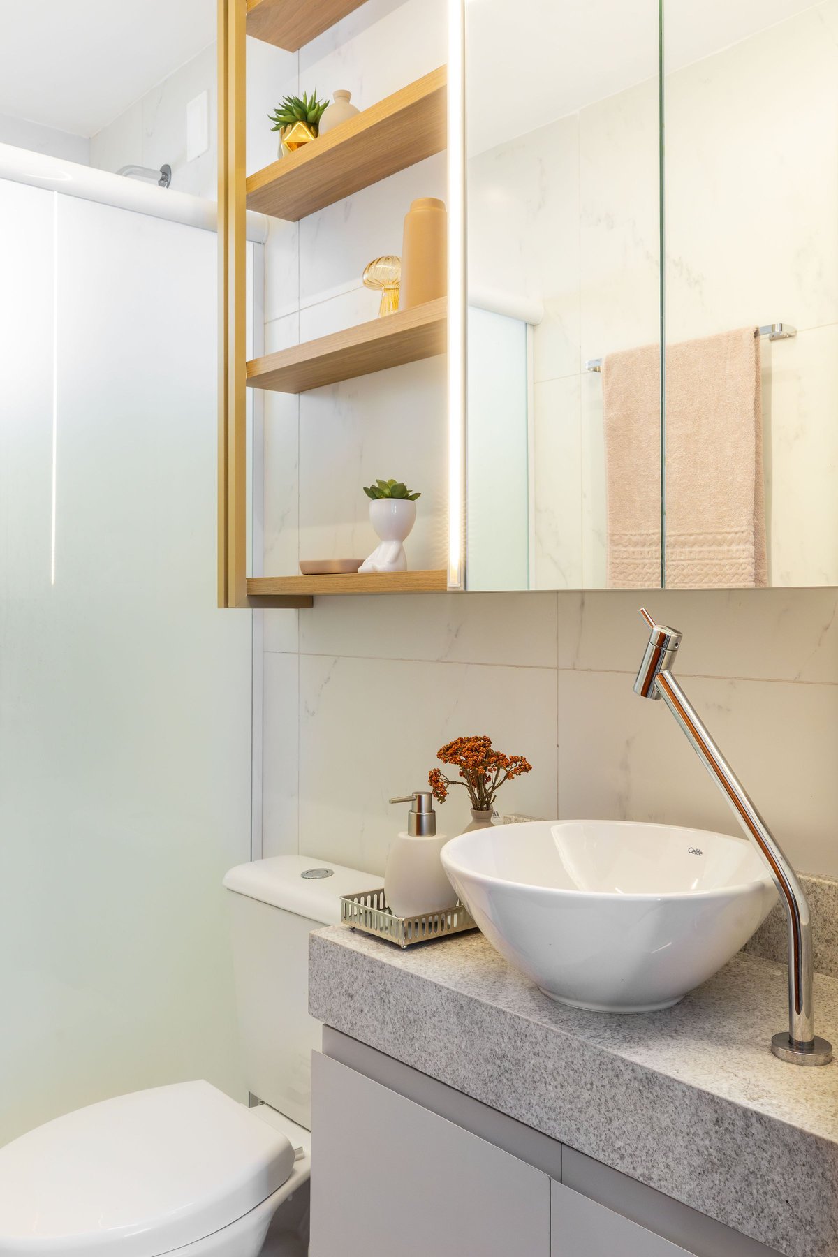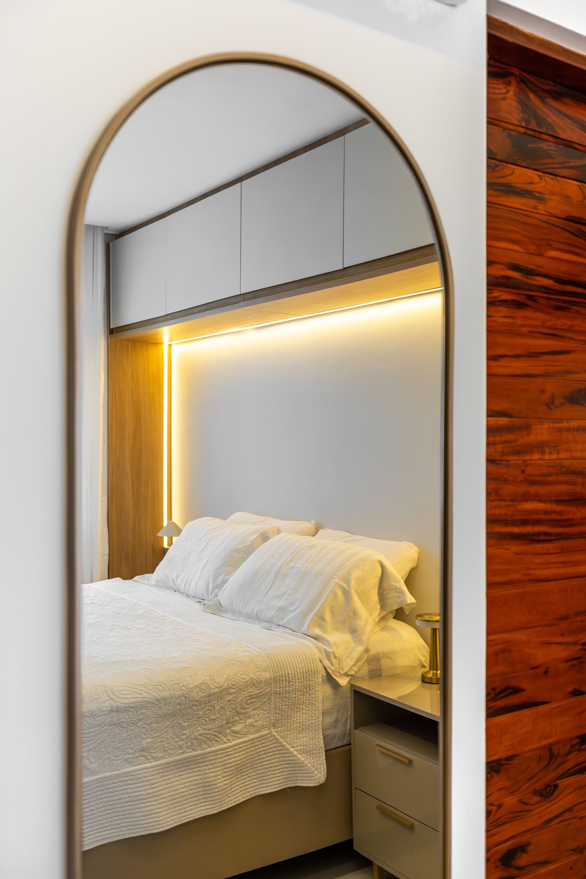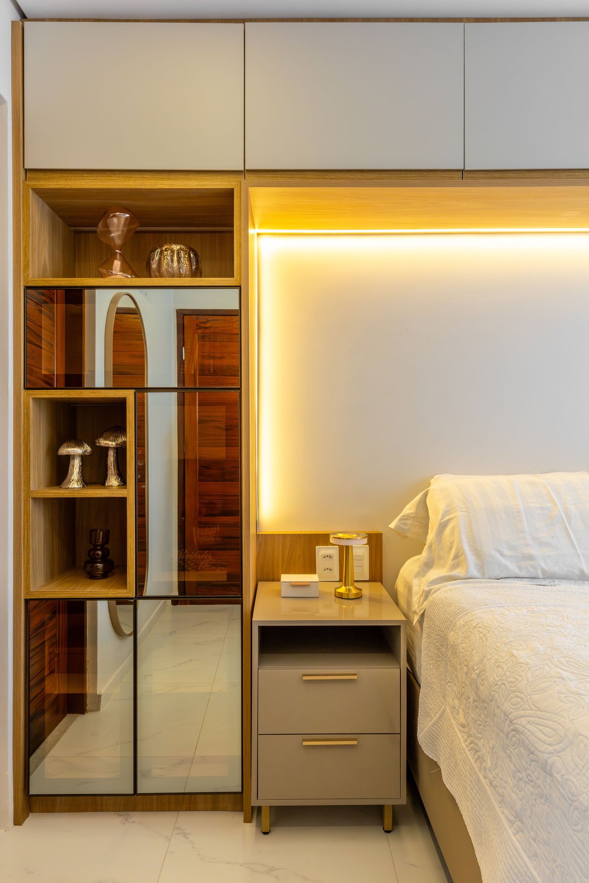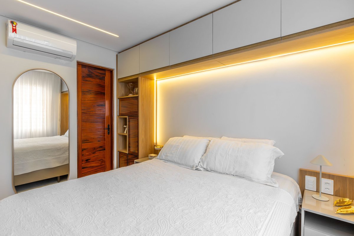 No banheiro, o destaque fica por conta do espelho com iluminação embutida e os nichos decorativos em madeira, trazendo leveza e sofisticação. O quarto do casal segue o mesmo conceito de integração e aproveitamento de espaço: o painel com iluminação linear atrás da cama cria um clima aconchegante, enquanto os armários superiores proporcionam maior armazenamento sem pesar visualmente.